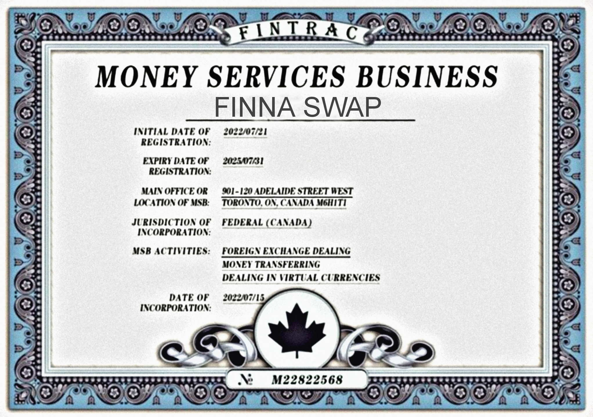 SINGAPORE , May 11, 2023 /PRNewswire/ -- Recently, Finna Swap exchange has once again achieved important results and successfully obtained the Canadian MSB (Money Services Business) license issued by the Financial Crime Regulatory Authority of Canada (FINTRAC). At the same time, Finna Swap Exchange already has a US MSB license issued by the US Financial Crimes Enforcement Network (FinCEN). With these two internationally recognized dual regulatory licenses, Finna Swap's cross-border regulatory advantages have become increasingly prominent, paving the way for its business development in the global market.
